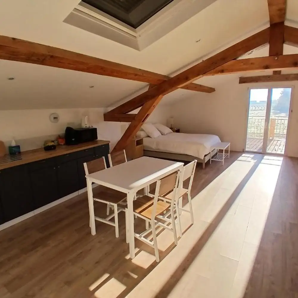 plus de 40 m², les deux chambres à l'étage disposent chacune de leur kitchenette équipée, d'un coin salon avec canapé (convertible en lit supplémentaire), d'une terrasse et d'une vue imprenable sur le
